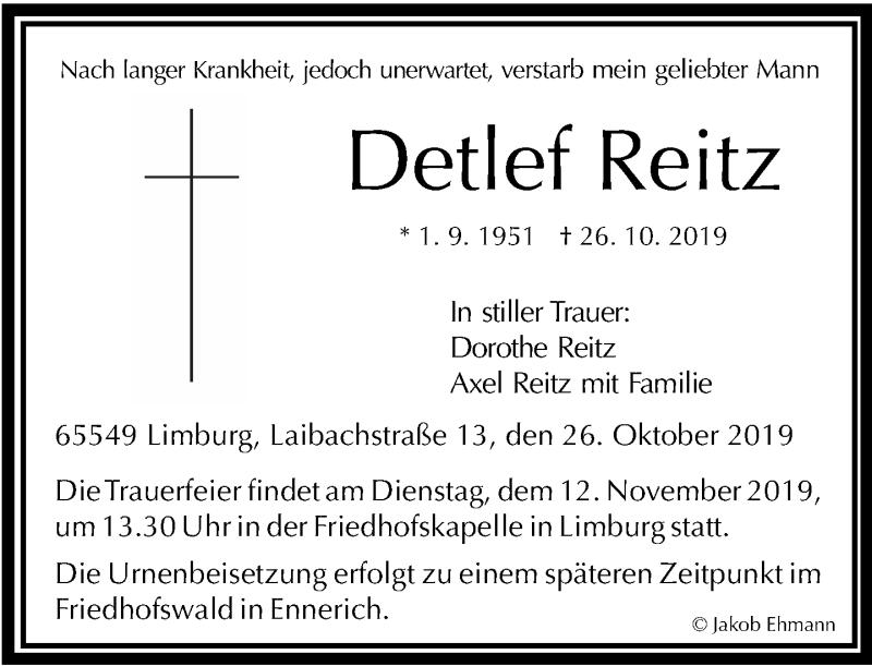 Hier finden Sie alle Traueranzeigen aus der Zeitung, die bisher für Detlef Reitz erschienen sind. Weitere Traueranzeigen, die in der Zeitung erscheinen, werden hier ebenfalls aufgelistet