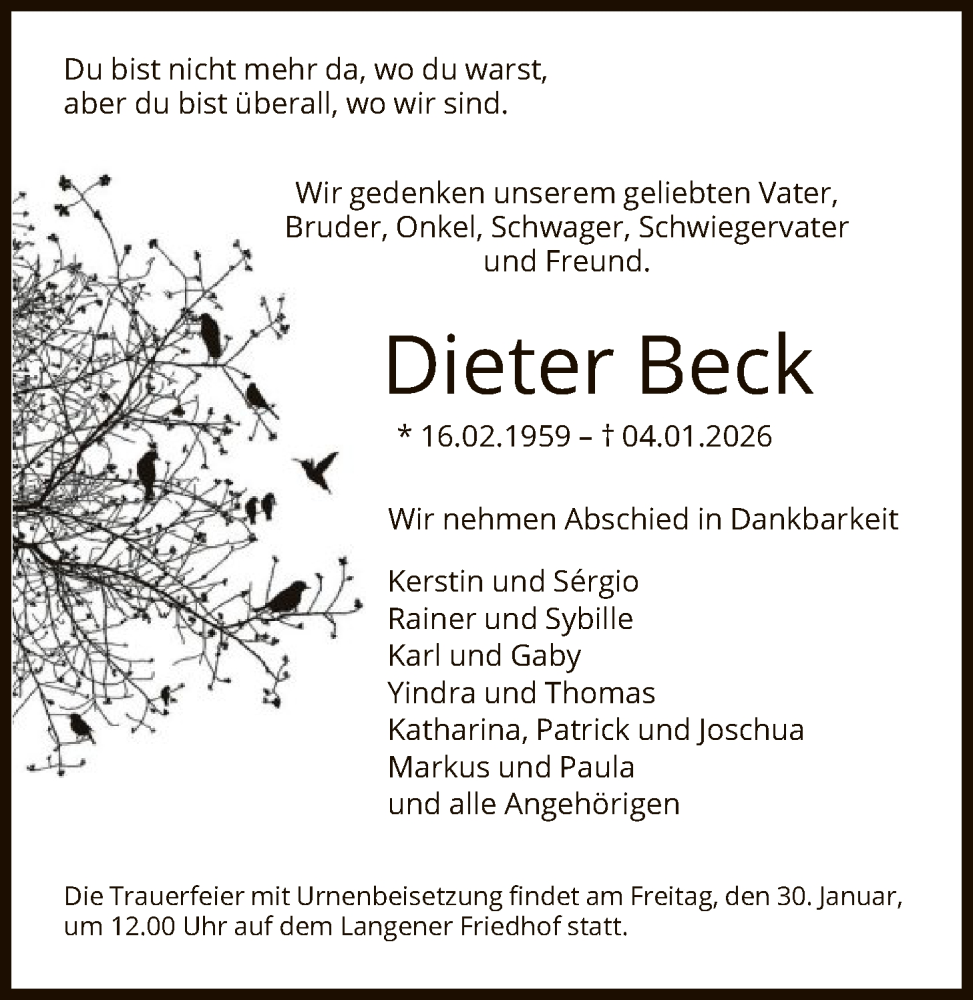 Hier finden Sie alle Traueranzeigen aus der Zeitung, die bisher für Dieter Beck erschienen sind. Weitere Traueranzeigen, die in der Zeitung erscheinen, werden hier ebenfalls aufgelistet