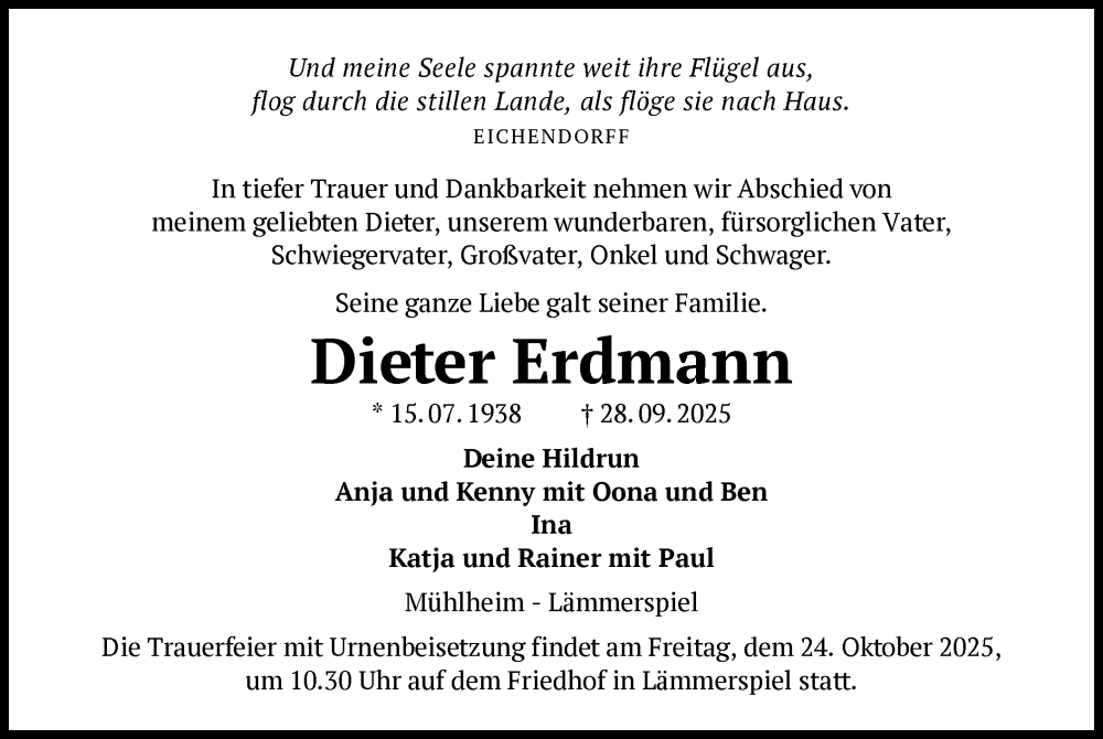 Hier finden Sie alle Traueranzeigen aus der Zeitung, die bisher für Dieter Erdmann erschienen sind. Weitere Traueranzeigen, die in der Zeitung erscheinen, werden hier ebenfalls aufgelistet