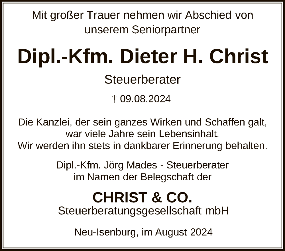 Hier finden Sie alle Traueranzeigen aus der Zeitung, die bisher für Dieter H. Christ erschienen sind. Weitere Traueranzeigen, die in der Zeitung erscheinen, werden hier ebenfalls aufgelistet