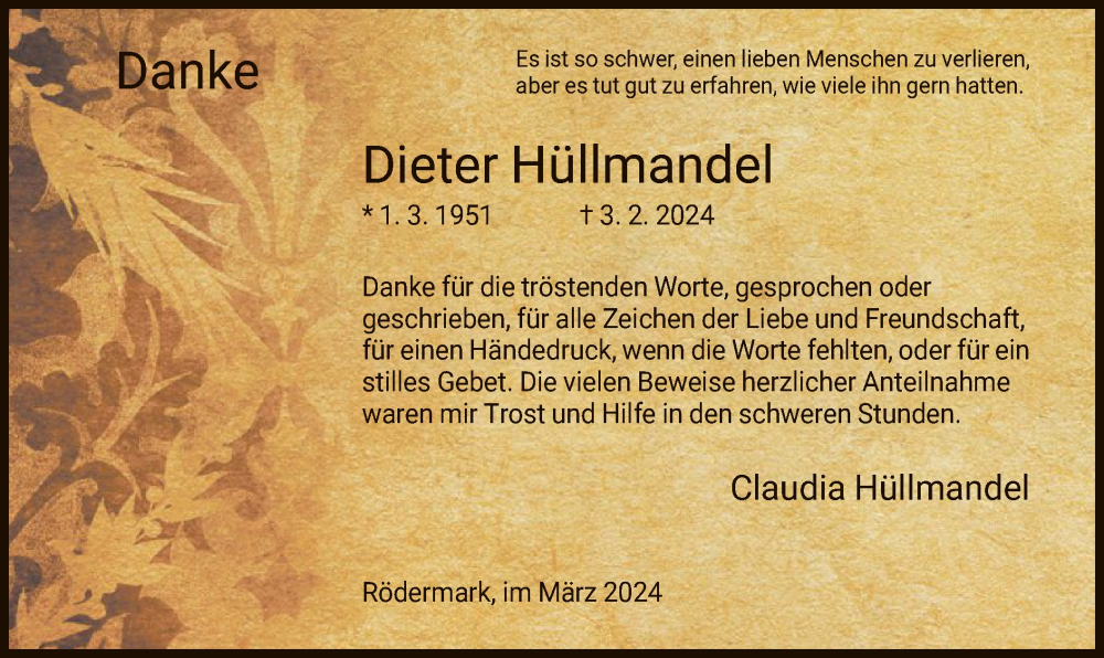 Hier finden Sie alle Traueranzeigen aus der Zeitung, die bisher für Dieter Hüllmandel erschienen sind. Weitere Traueranzeigen, die in der Zeitung erscheinen, werden hier ebenfalls aufgelistet