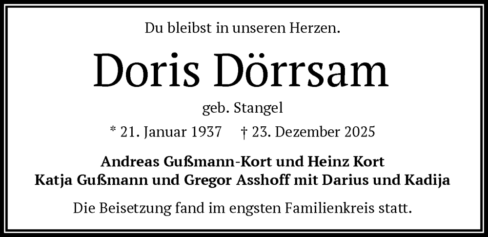 Hier finden Sie alle Traueranzeigen aus der Zeitung, die bisher für Doris Dörrsam erschienen sind. Weitere Traueranzeigen, die in der Zeitung erscheinen, werden hier ebenfalls aufgelistet