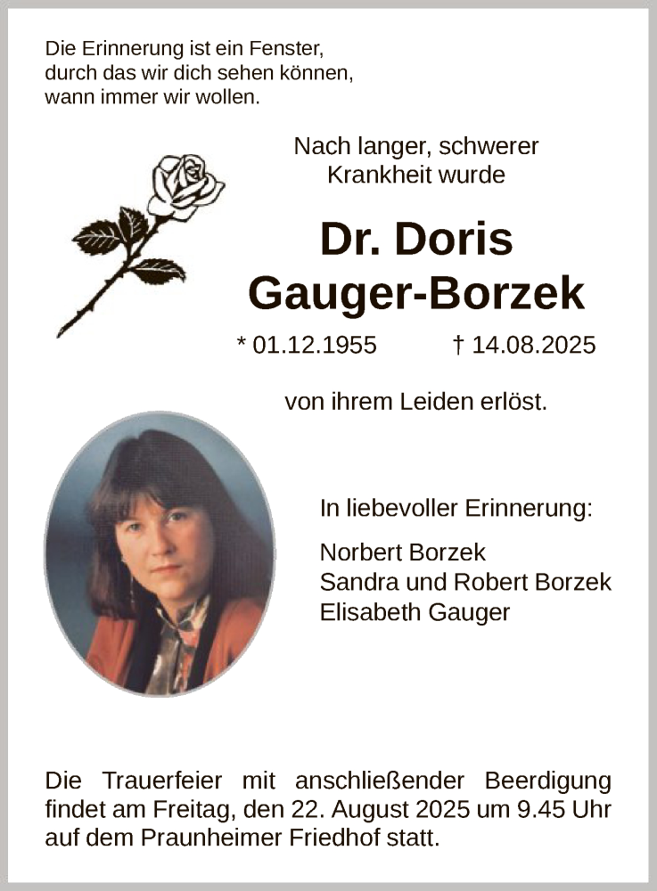 Hier finden Sie alle Traueranzeigen aus der Zeitung, die bisher für Doris Gauger-Borzek erschienen sind. Weitere Traueranzeigen, die in der Zeitung erscheinen, werden hier ebenfalls aufgelistet