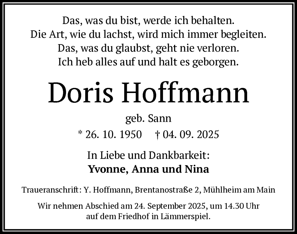 Hier finden Sie alle Traueranzeigen aus der Zeitung, die bisher für Doris Hoffmann erschienen sind. Weitere Traueranzeigen, die in der Zeitung erscheinen, werden hier ebenfalls aufgelistet