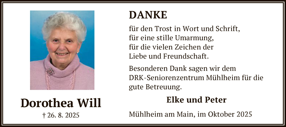 Hier finden Sie alle Traueranzeigen aus der Zeitung, die bisher für Dorothea Will erschienen sind. Weitere Traueranzeigen, die in der Zeitung erscheinen, werden hier ebenfalls aufgelistet