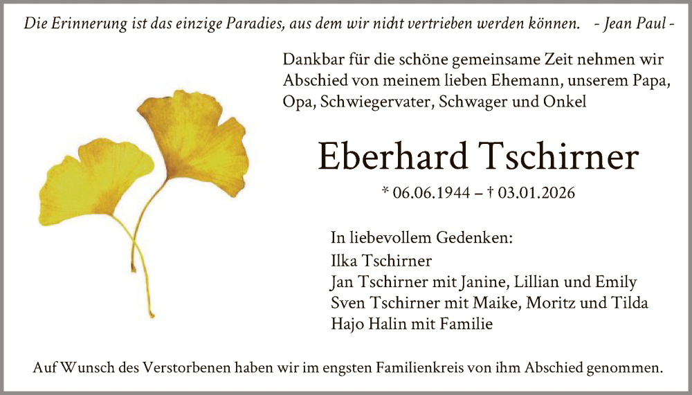 Hier finden Sie alle Traueranzeigen aus der Zeitung, die bisher für Eberhard Tschirner erschienen sind. Weitere Traueranzeigen, die in der Zeitung erscheinen, werden hier ebenfalls aufgelistet