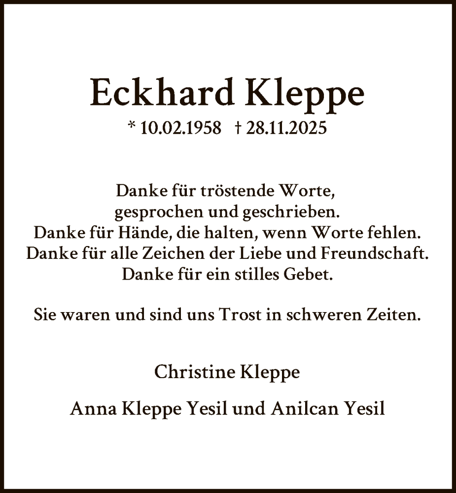 Hier finden Sie alle Traueranzeigen aus der Zeitung, die bisher für Eckhard Kleppe erschienen sind. Weitere Traueranzeigen, die in der Zeitung erscheinen, werden hier ebenfalls aufgelistet