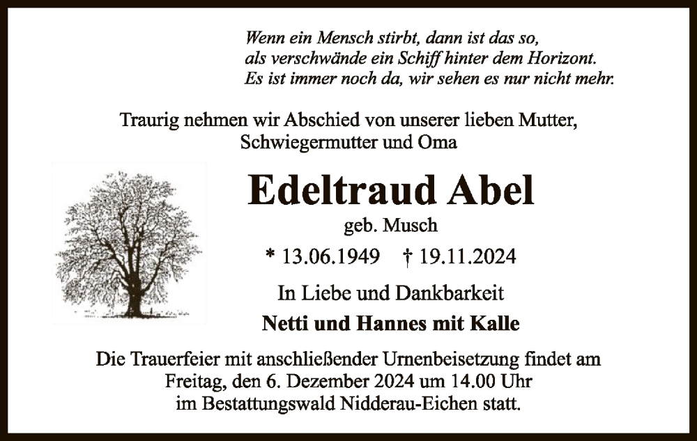 Hier finden Sie alle Traueranzeigen aus der Zeitung, die bisher für Edeltraud Abel erschienen sind. Weitere Traueranzeigen, die in der Zeitung erscheinen, werden hier ebenfalls aufgelistet
