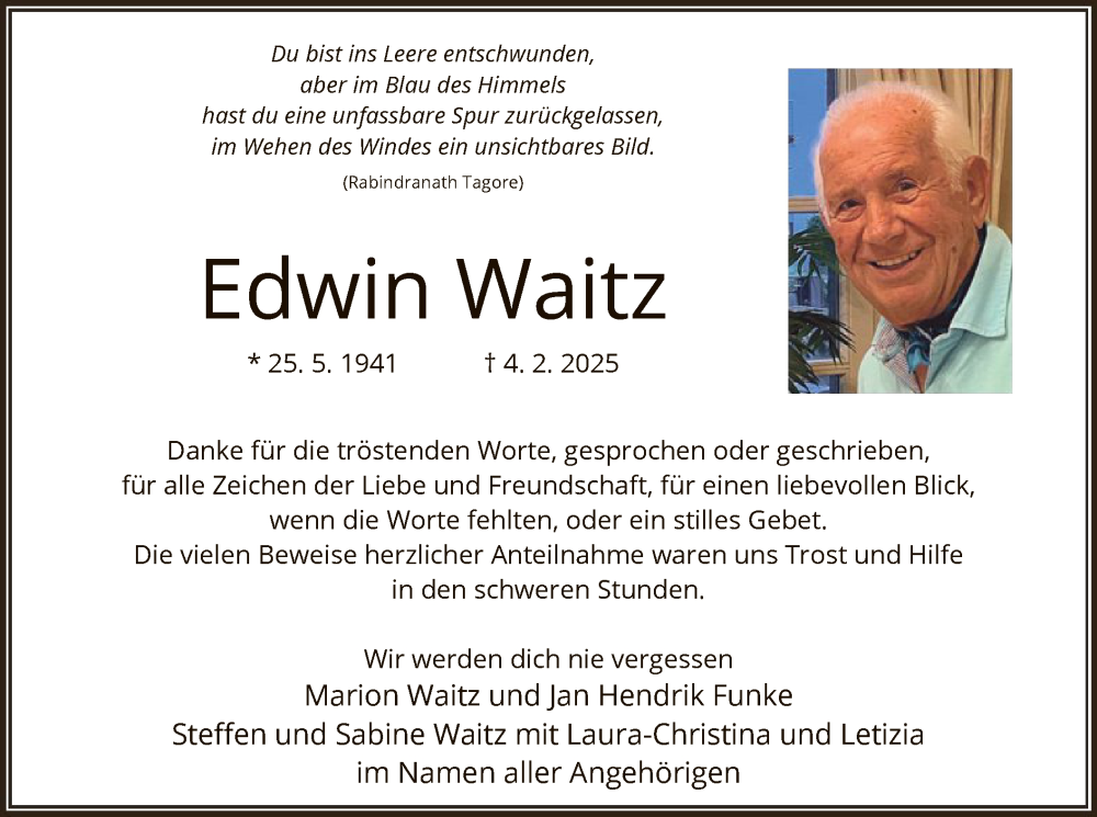 Hier finden Sie alle Traueranzeigen aus der Zeitung, die bisher für Edwin Waitz erschienen sind. Weitere Traueranzeigen, die in der Zeitung erscheinen, werden hier ebenfalls aufgelistet