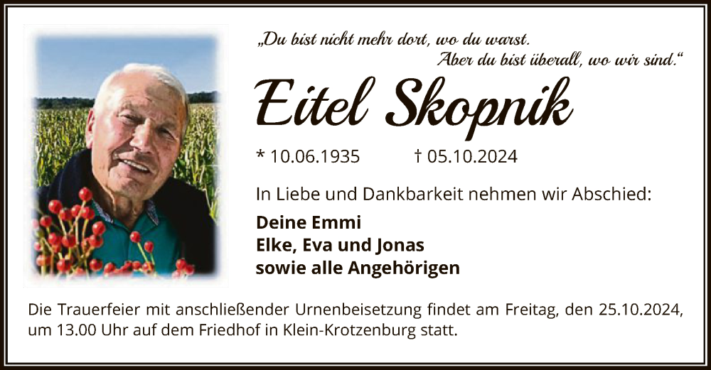 Hier finden Sie alle Traueranzeigen aus der Zeitung, die bisher für Eitel Skopnik erschienen sind. Weitere Traueranzeigen, die in der Zeitung erscheinen, werden hier ebenfalls aufgelistet