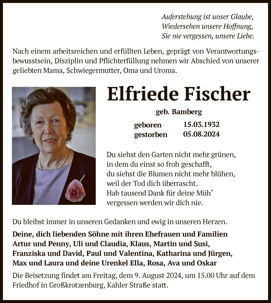 Hier finden Sie alle Traueranzeigen aus der Zeitung, die bisher für Elfriede Fischer erschienen sind. Weitere Traueranzeigen, die in der Zeitung erscheinen, werden hier ebenfalls aufgelistet