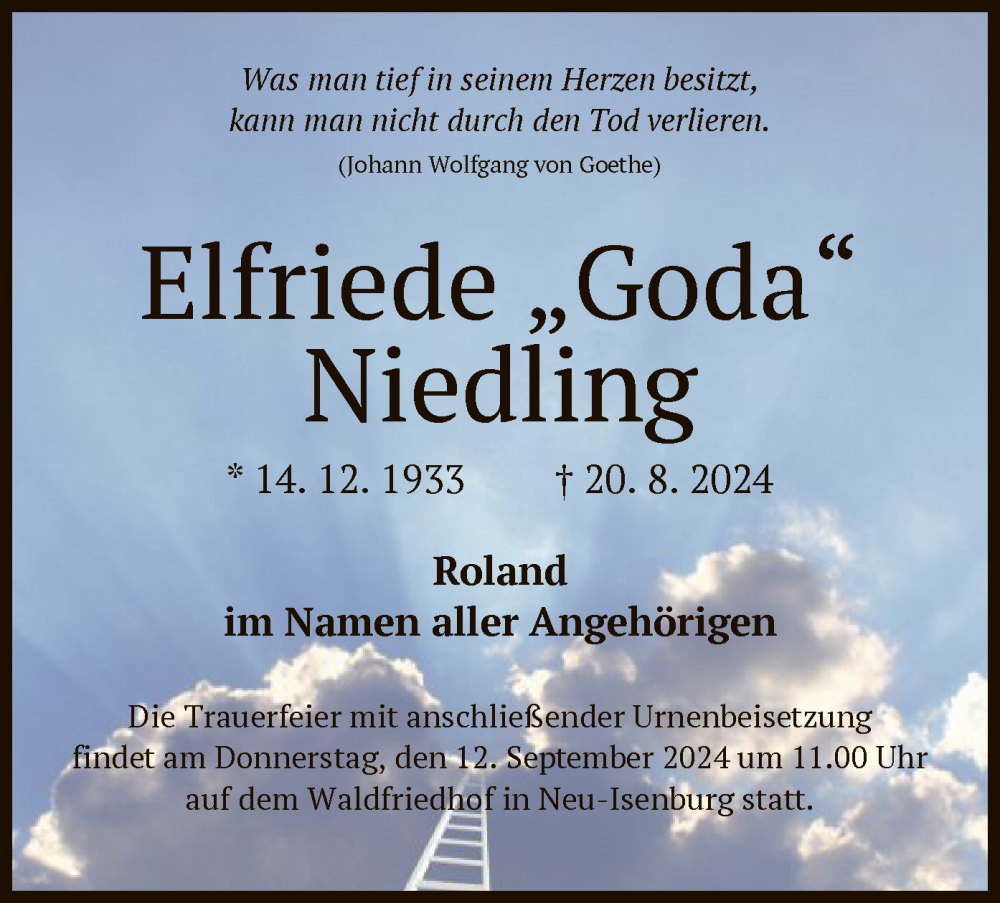 Hier finden Sie alle Traueranzeigen aus der Zeitung, die bisher für Elfriede Niedling erschienen sind. Weitere Traueranzeigen, die in der Zeitung erscheinen, werden hier ebenfalls aufgelistet