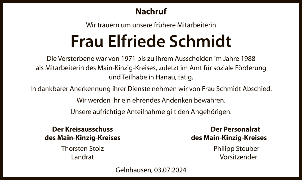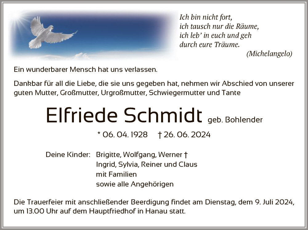Hier finden Sie alle Traueranzeigen aus der Zeitung, die bisher für Elfriede Schmidt erschienen sind. Weitere Traueranzeigen, die in der Zeitung erscheinen, werden hier ebenfalls aufgelistet
