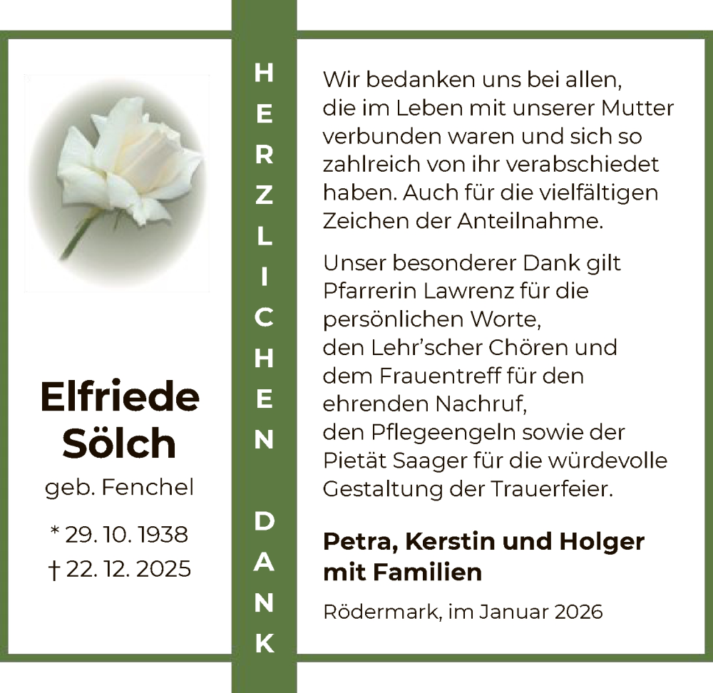 Hier finden Sie alle Traueranzeigen aus der Zeitung, die bisher für Elfriede Sölch erschienen sind. Weitere Traueranzeigen, die in der Zeitung erscheinen, werden hier ebenfalls aufgelistet