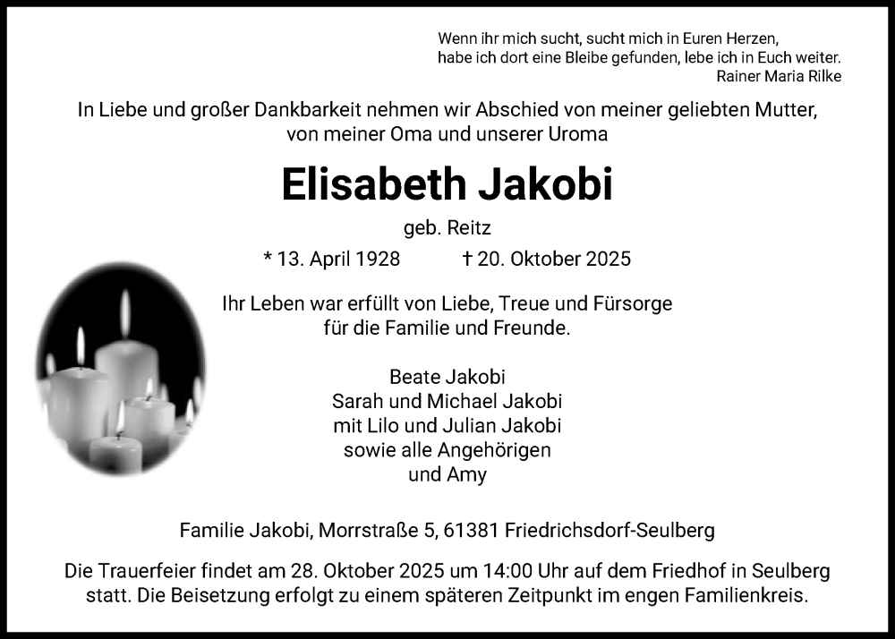 Hier finden Sie alle Traueranzeigen aus der Zeitung, die bisher für Elisabeth Jakobi erschienen sind. Weitere Traueranzeigen, die in der Zeitung erscheinen, werden hier ebenfalls aufgelistet