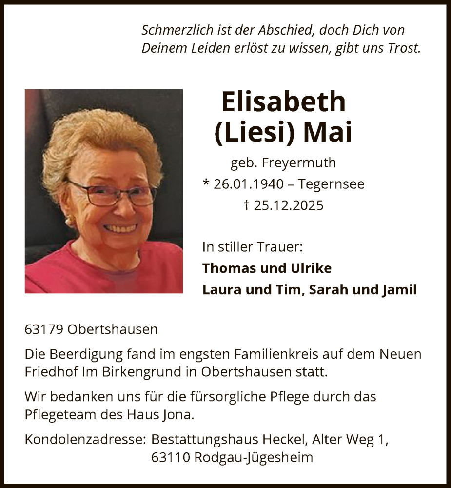 Hier finden Sie alle Traueranzeigen aus der Zeitung, die bisher für Elisabeth Mai erschienen sind. Weitere Traueranzeigen, die in der Zeitung erscheinen, werden hier ebenfalls aufgelistet