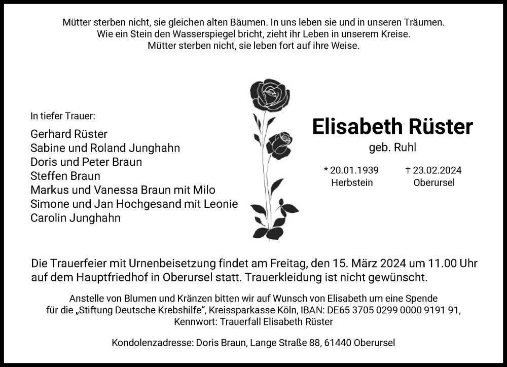 Hier finden Sie alle Traueranzeigen aus der Zeitung, die bisher für Elisabeth Rüster erschienen sind. Weitere Traueranzeigen, die in der Zeitung erscheinen, werden hier ebenfalls aufgelistet