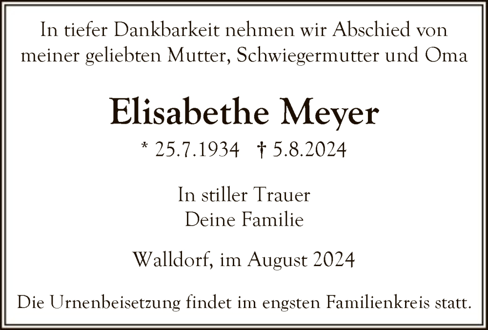 Hier finden Sie alle Traueranzeigen aus der Zeitung, die bisher für Elisabethe Meyer erschienen sind. Weitere Traueranzeigen, die in der Zeitung erscheinen, werden hier ebenfalls aufgelistet