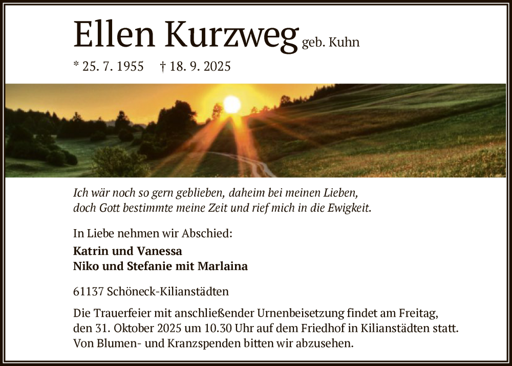 Hier finden Sie alle Traueranzeigen aus der Zeitung, die bisher für Ellen Kurzweg erschienen sind. Weitere Traueranzeigen, die in der Zeitung erscheinen, werden hier ebenfalls aufgelistet