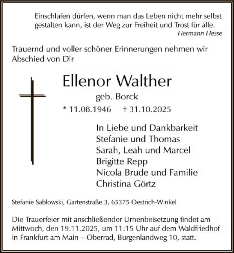 Hier finden Sie alle Traueranzeigen aus der Zeitung, die bisher für Ellenor Walther erschienen sind. Weitere Traueranzeigen, die in der Zeitung erscheinen, werden hier ebenfalls aufgelistet