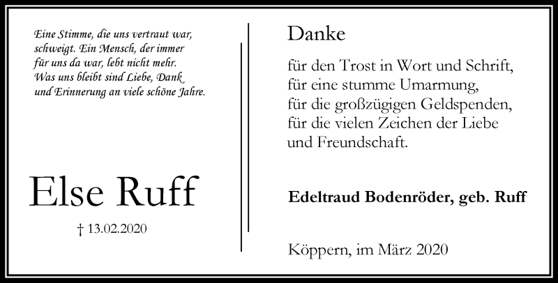 Hier finden Sie alle Traueranzeigen aus der Zeitung, die bisher für Else Ruff erschienen sind. Weitere Traueranzeigen, die in der Zeitung erscheinen, werden hier ebenfalls aufgelistet