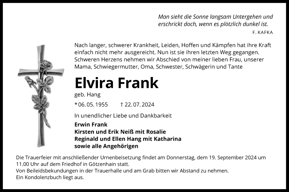 Hier finden Sie alle Traueranzeigen aus der Zeitung, die bisher für Elvira Frank erschienen sind. Weitere Traueranzeigen, die in der Zeitung erscheinen, werden hier ebenfalls aufgelistet