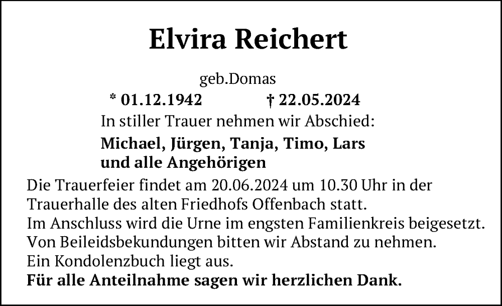 Hier finden Sie alle Traueranzeigen aus der Zeitung, die bisher für Elvira Reichert erschienen sind. Weitere Traueranzeigen, die in der Zeitung erscheinen, werden hier ebenfalls aufgelistet