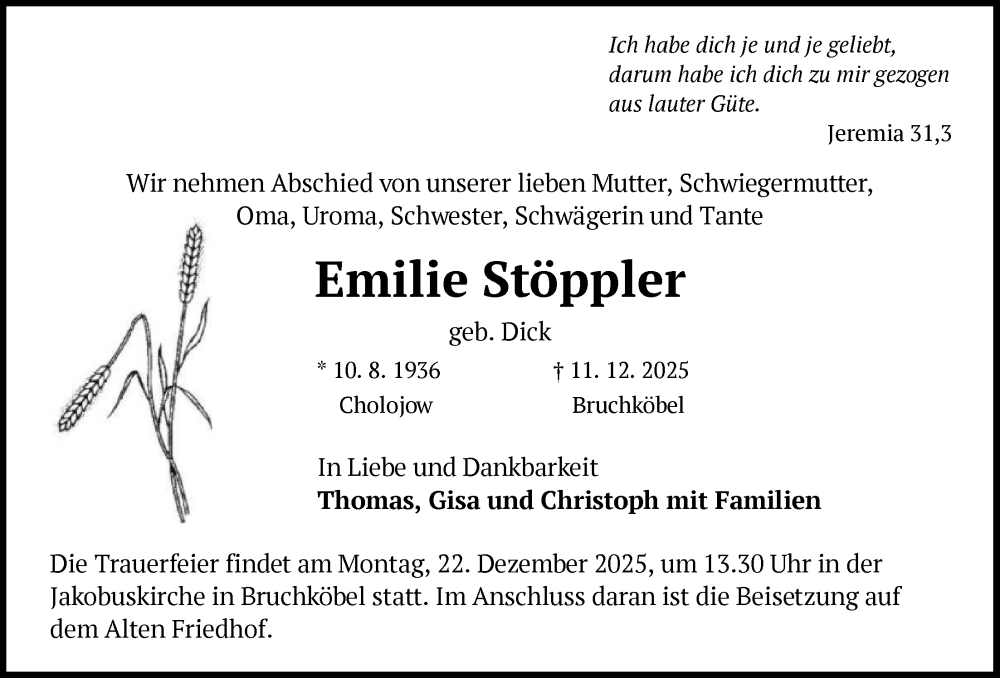 Hier finden Sie alle Traueranzeigen aus der Zeitung, die bisher für Emilie Stöppler erschienen sind. Weitere Traueranzeigen, die in der Zeitung erscheinen, werden hier ebenfalls aufgelistet