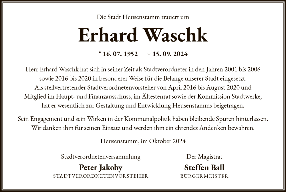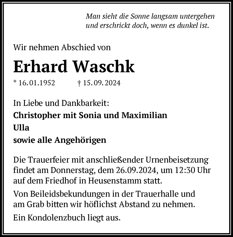 Hier finden Sie alle Traueranzeigen aus der Zeitung, die bisher für Erhard Waschk erschienen sind. Weitere Traueranzeigen, die in der Zeitung erscheinen, werden hier ebenfalls aufgelistet