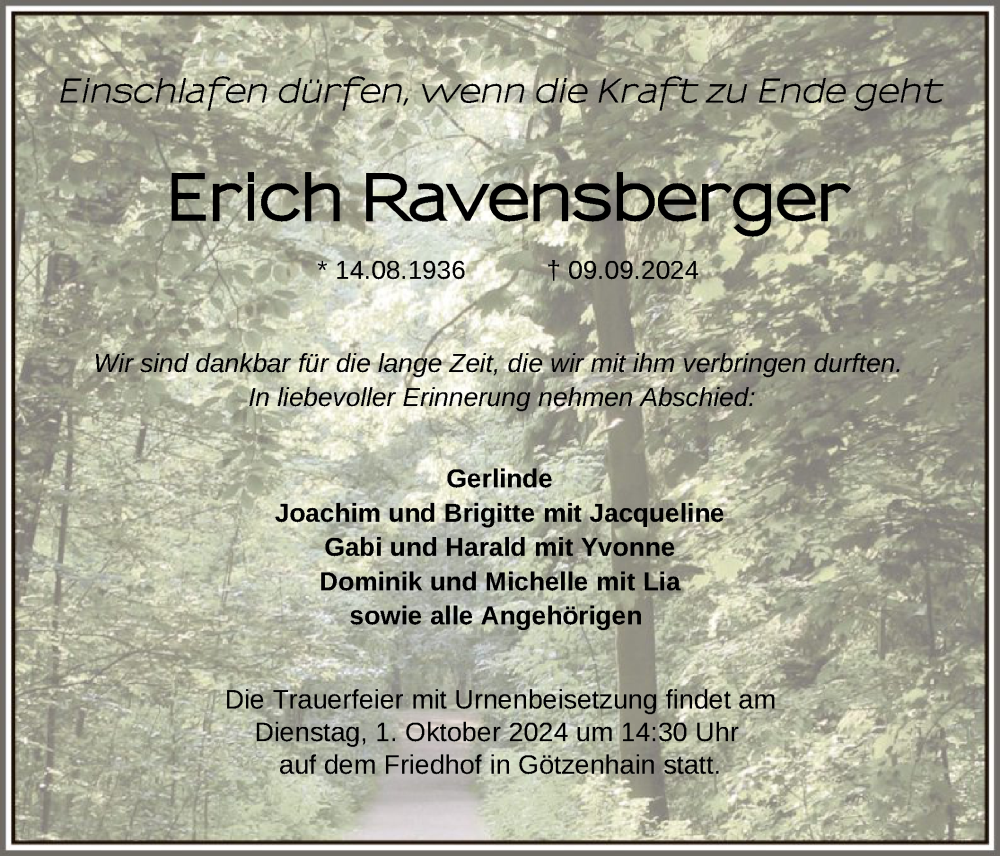 Hier finden Sie alle Traueranzeigen aus der Zeitung, die bisher für Erich Ravensberger erschienen sind. Weitere Traueranzeigen, die in der Zeitung erscheinen, werden hier ebenfalls aufgelistet