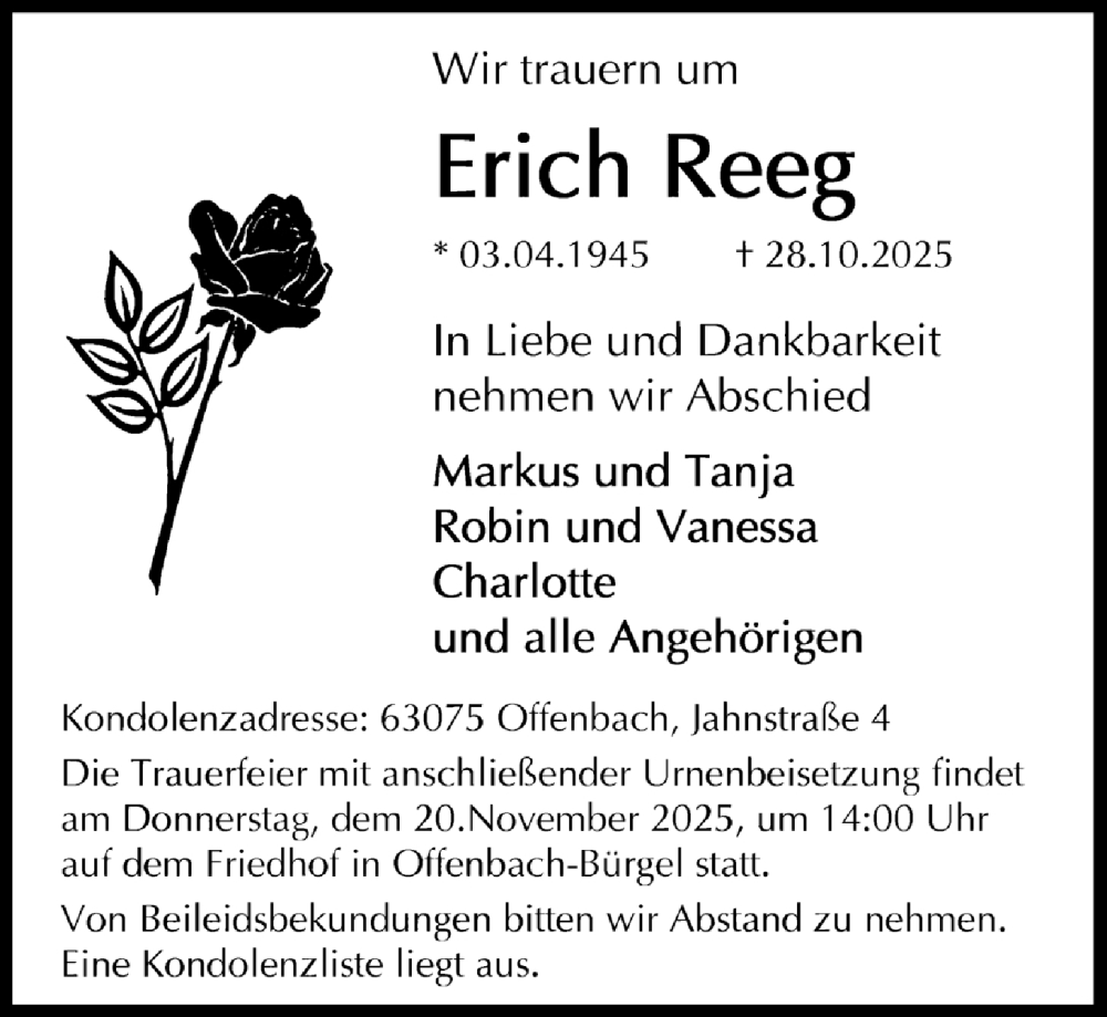 Hier finden Sie alle Traueranzeigen aus der Zeitung, die bisher für Erich Reeg erschienen sind. Weitere Traueranzeigen, die in der Zeitung erscheinen, werden hier ebenfalls aufgelistet