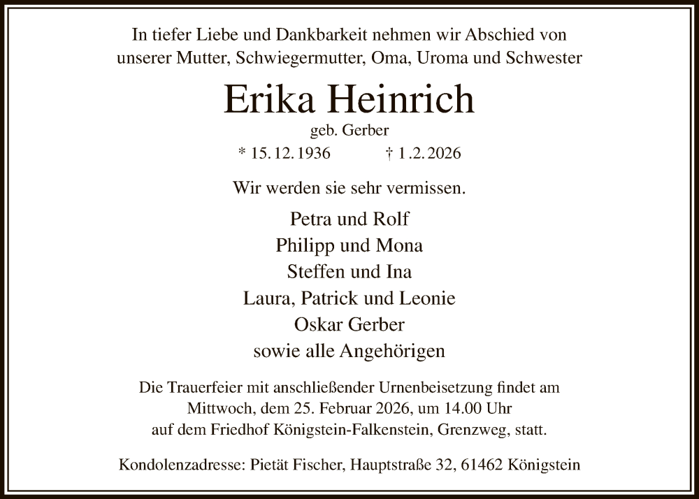 Hier finden Sie alle Traueranzeigen aus der Zeitung, die bisher für Erika Heinrich erschienen sind. Weitere Traueranzeigen, die in der Zeitung erscheinen, werden hier ebenfalls aufgelistet