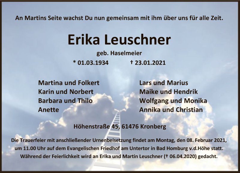 Hier finden Sie alle Traueranzeigen aus der Zeitung, die bisher für Erika Leuschner erschienen sind. Weitere Traueranzeigen, die in der Zeitung erscheinen, werden hier ebenfalls aufgelistet