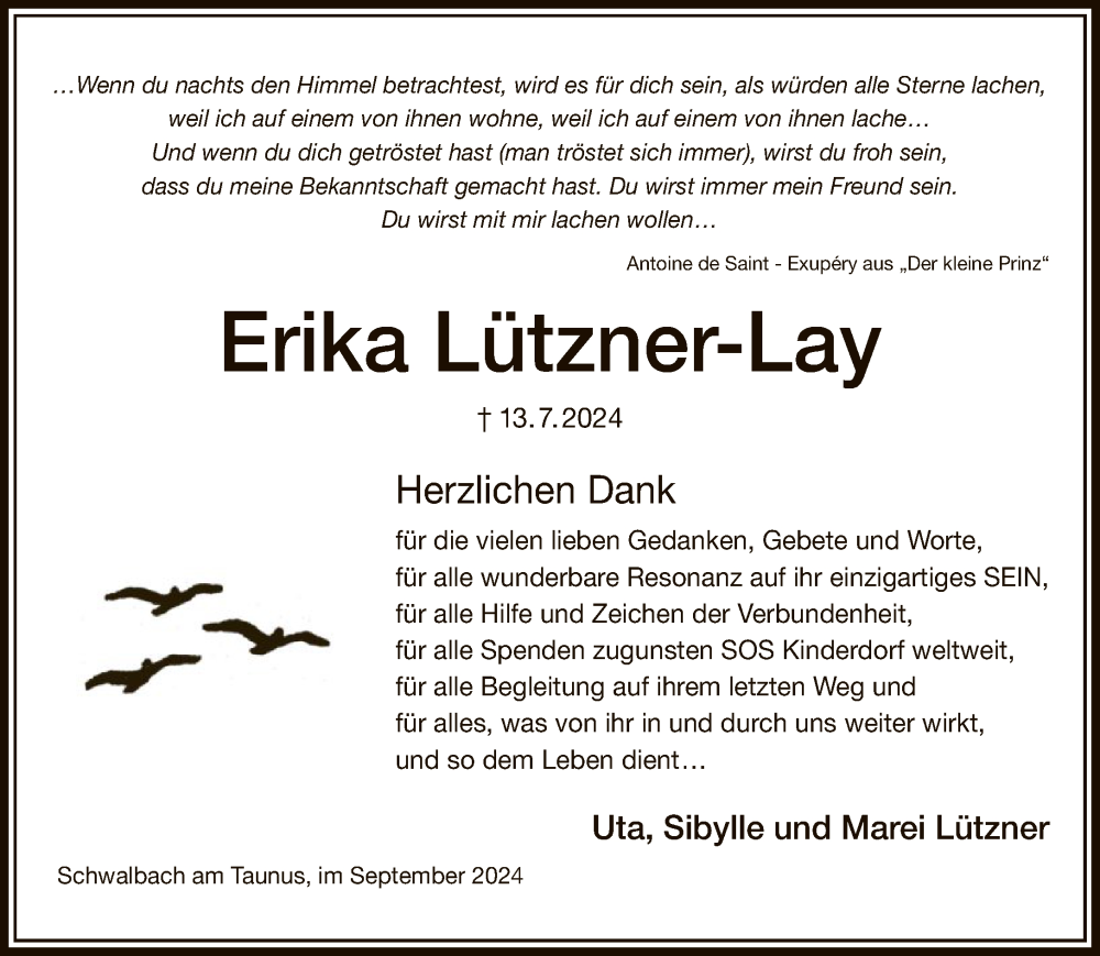 Hier finden Sie alle Traueranzeigen aus der Zeitung, die bisher für Erika Lützner-Lay erschienen sind. Weitere Traueranzeigen, die in der Zeitung erscheinen, werden hier ebenfalls aufgelistet