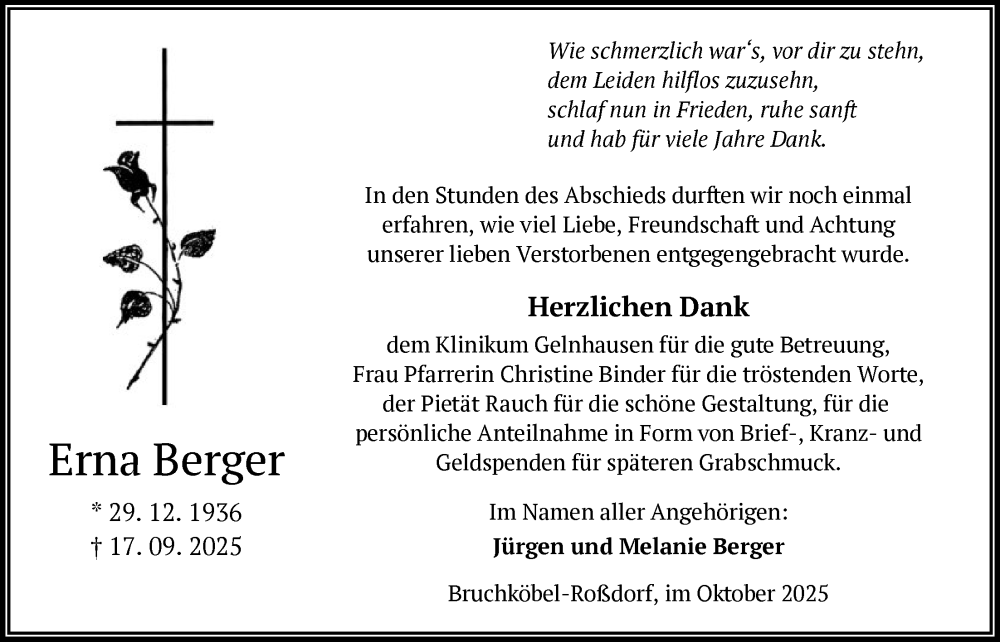 Hier finden Sie alle Traueranzeigen aus der Zeitung, die bisher für Erna Berger erschienen sind. Weitere Traueranzeigen, die in der Zeitung erscheinen, werden hier ebenfalls aufgelistet