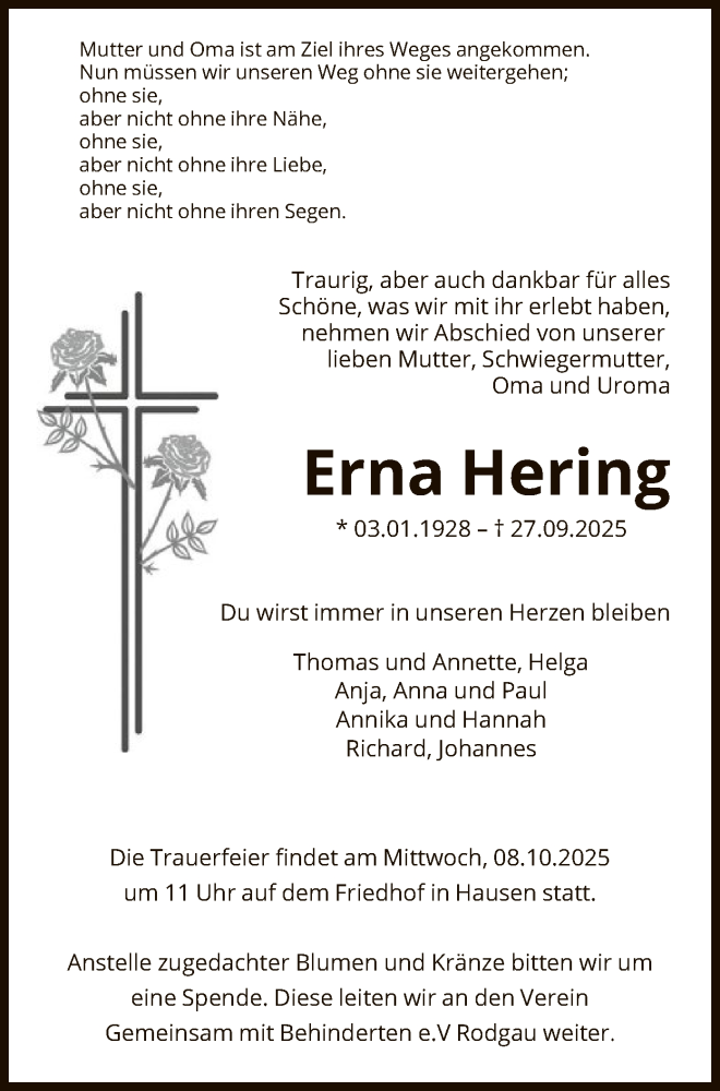 Hier finden Sie alle Traueranzeigen aus der Zeitung, die bisher für Erna Hering erschienen sind. Weitere Traueranzeigen, die in der Zeitung erscheinen, werden hier ebenfalls aufgelistet