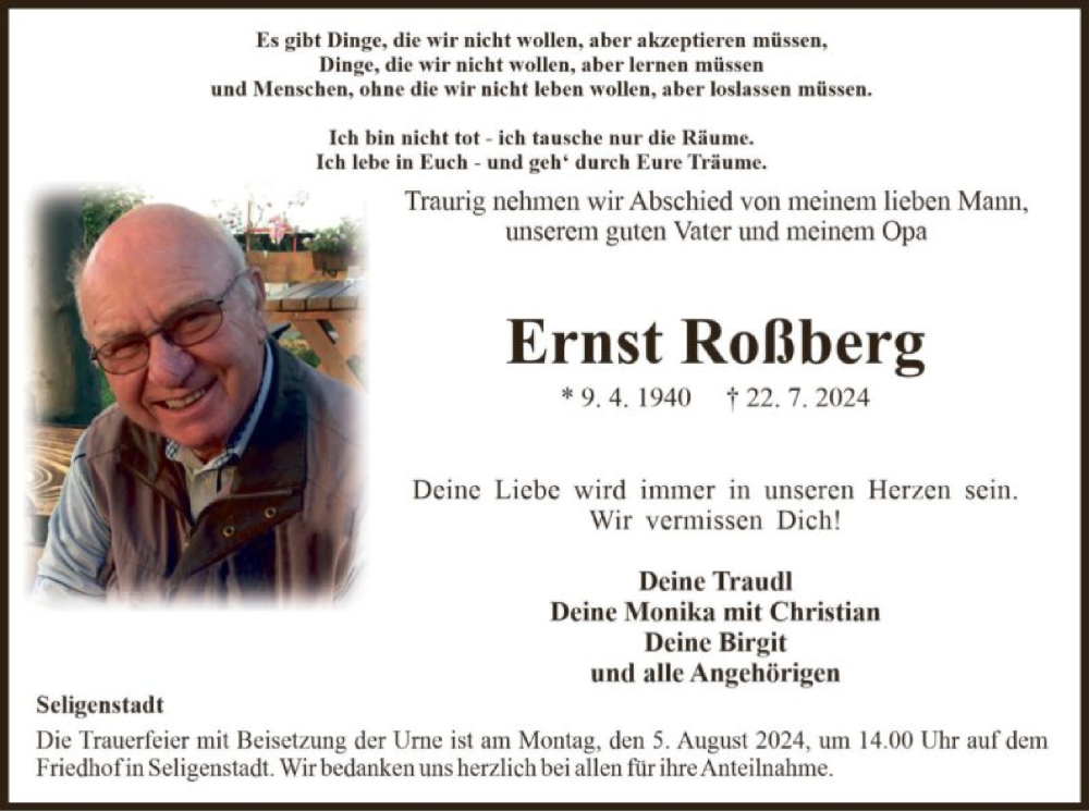 Hier finden Sie alle Traueranzeigen aus der Zeitung, die bisher für Ernst Roßberg erschienen sind. Weitere Traueranzeigen, die in der Zeitung erscheinen, werden hier ebenfalls aufgelistet