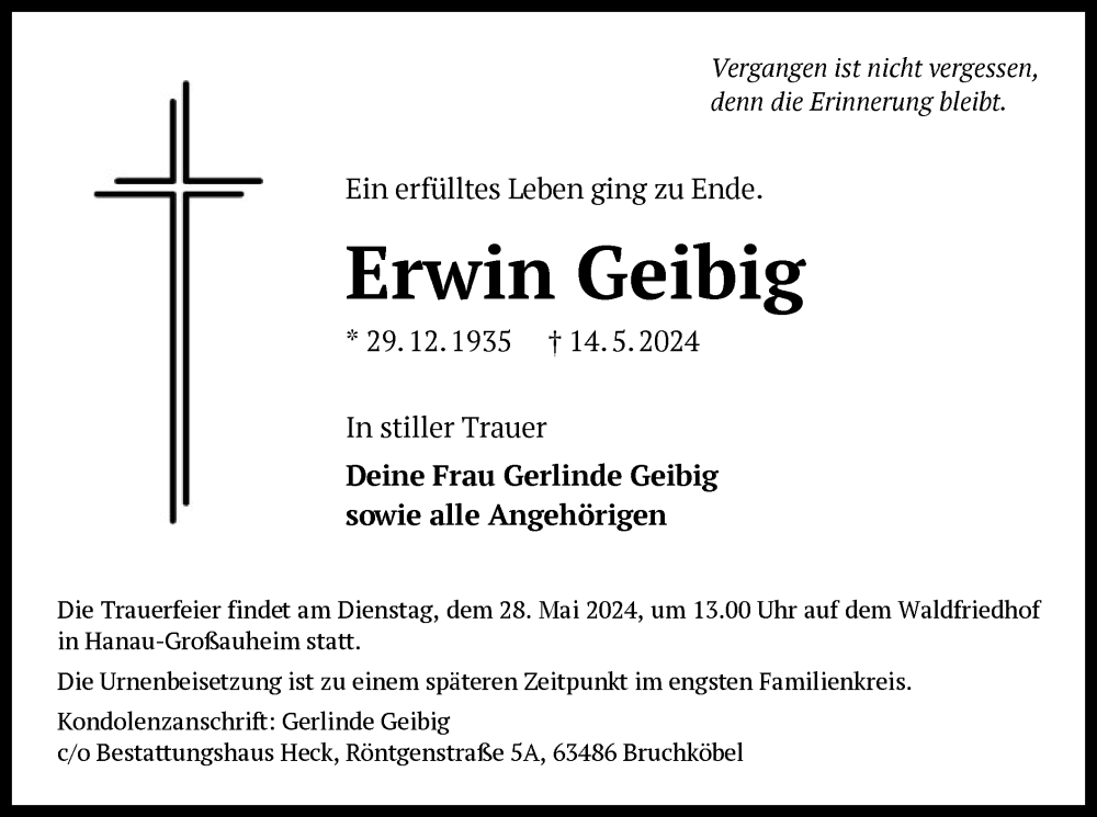 Hier finden Sie alle Traueranzeigen aus der Zeitung, die bisher für Erwin Geibig erschienen sind. Weitere Traueranzeigen, die in der Zeitung erscheinen, werden hier ebenfalls aufgelistet