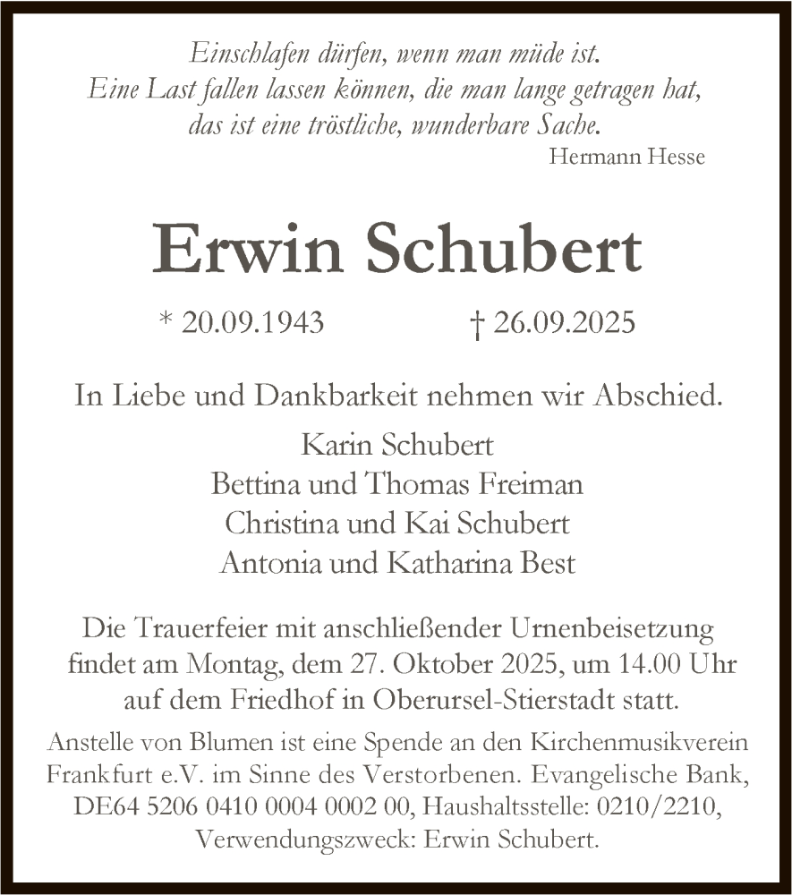 Hier finden Sie alle Traueranzeigen aus der Zeitung, die bisher für Erwin Schubert erschienen sind. Weitere Traueranzeigen, die in der Zeitung erscheinen, werden hier ebenfalls aufgelistet