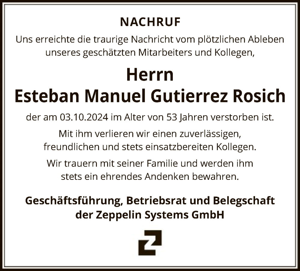 Hier finden Sie alle Traueranzeigen aus der Zeitung, die bisher für Esteban Manuel Gutierrez Rosich erschienen sind. Weitere Traueranzeigen, die in der Zeitung erscheinen, werden hier ebenfalls aufgelistet