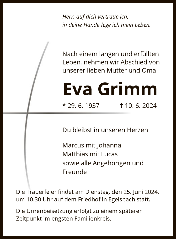 Hier finden Sie alle Traueranzeigen aus der Zeitung, die bisher für Eva Grimm erschienen sind. Weitere Traueranzeigen, die in der Zeitung erscheinen, werden hier ebenfalls aufgelistet