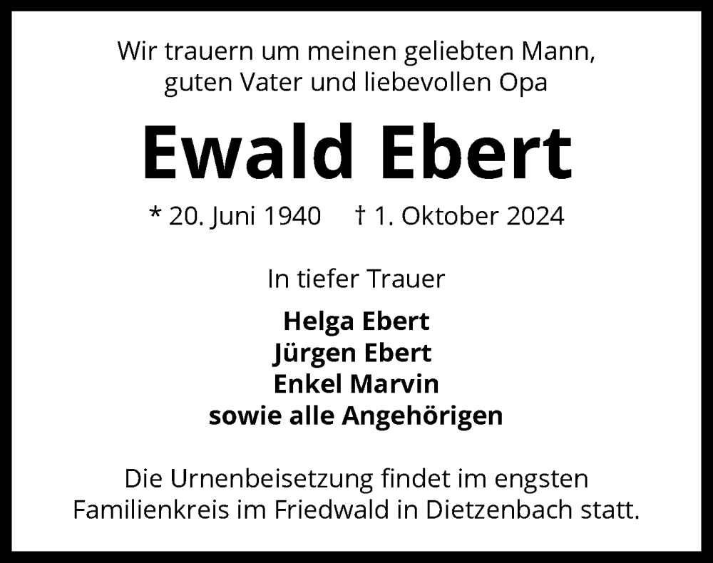 Hier finden Sie alle Traueranzeigen aus der Zeitung, die bisher für Ewald Ebert erschienen sind. Weitere Traueranzeigen, die in der Zeitung erscheinen, werden hier ebenfalls aufgelistet