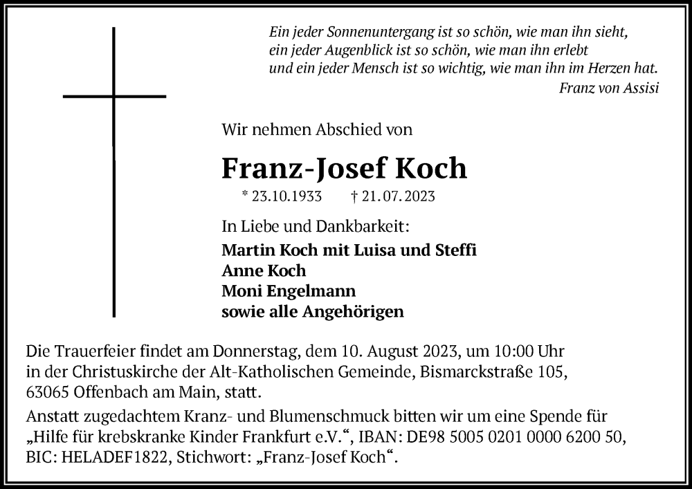Hier finden Sie alle Traueranzeigen aus der Zeitung, die bisher für Franz-Josef Koch erschienen sind. Weitere Traueranzeigen, die in der Zeitung erscheinen, werden hier ebenfalls aufgelistet