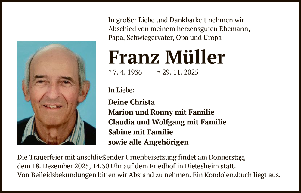 Hier finden Sie alle Traueranzeigen aus der Zeitung, die bisher für Franz Müller erschienen sind. Weitere Traueranzeigen, die in der Zeitung erscheinen, werden hier ebenfalls aufgelistet
