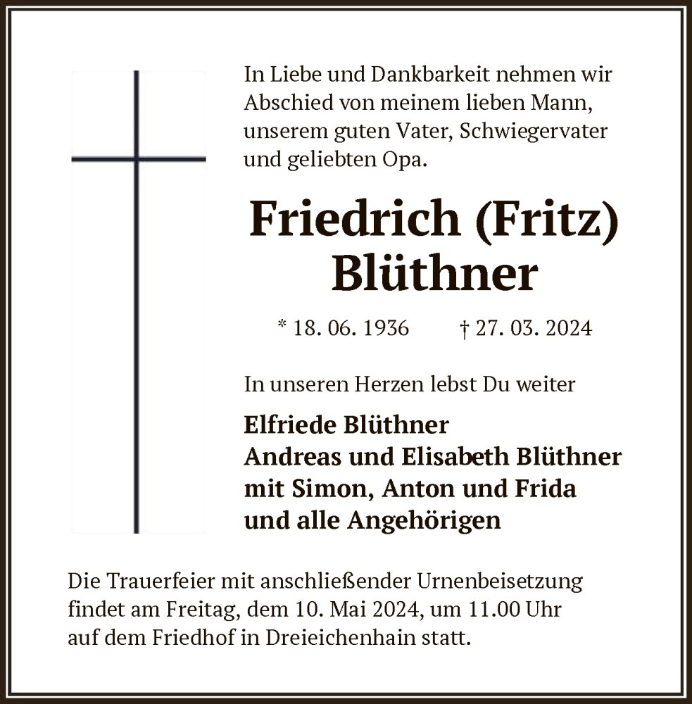 Hier finden Sie alle Traueranzeigen aus der Zeitung, die bisher für Friedrich Blüthner erschienen sind. Weitere Traueranzeigen, die in der Zeitung erscheinen, werden hier ebenfalls aufgelistet