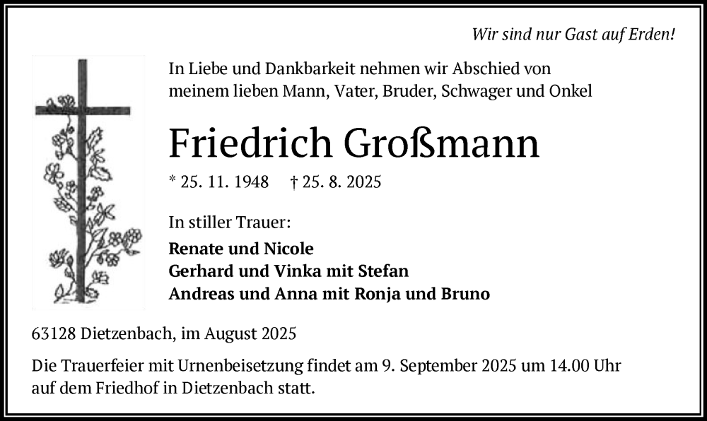 Hier finden Sie alle Traueranzeigen aus der Zeitung, die bisher für Friedrich Großmann erschienen sind. Weitere Traueranzeigen, die in der Zeitung erscheinen, werden hier ebenfalls aufgelistet