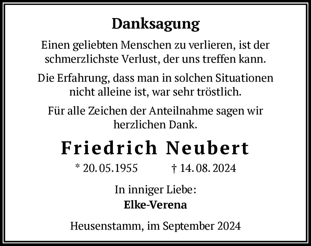 Hier finden Sie alle Traueranzeigen aus der Zeitung, die bisher für Friedrich Neubert erschienen sind. Weitere Traueranzeigen, die in der Zeitung erscheinen, werden hier ebenfalls aufgelistet
