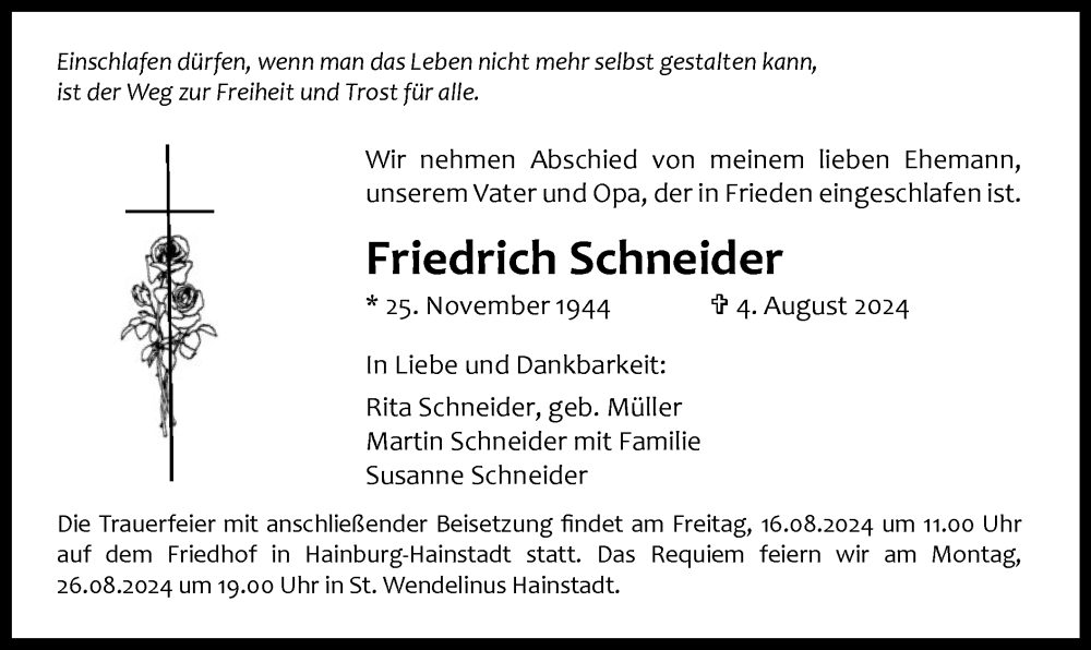 Hier finden Sie alle Traueranzeigen aus der Zeitung, die bisher für Friedrich Schneider erschienen sind. Weitere Traueranzeigen, die in der Zeitung erscheinen, werden hier ebenfalls aufgelistet