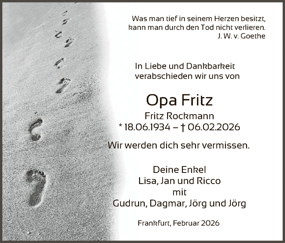 Hier finden Sie alle Traueranzeigen aus der Zeitung, die bisher für Fritz Rockmann erschienen sind. Weitere Traueranzeigen, die in der Zeitung erscheinen, werden hier ebenfalls aufgelistet