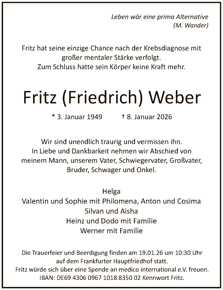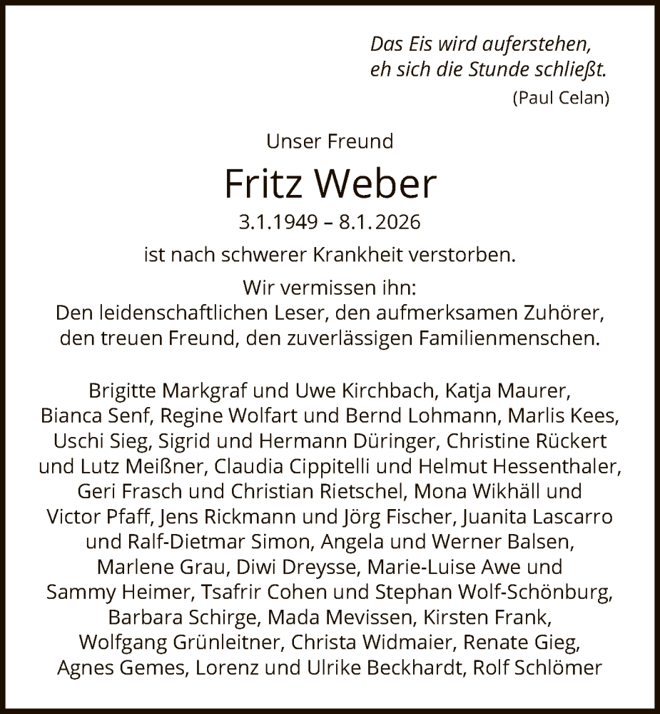Hier finden Sie alle Traueranzeigen aus der Zeitung, die bisher für Fritz Weber erschienen sind. Weitere Traueranzeigen, die in der Zeitung erscheinen, werden hier ebenfalls aufgelistet